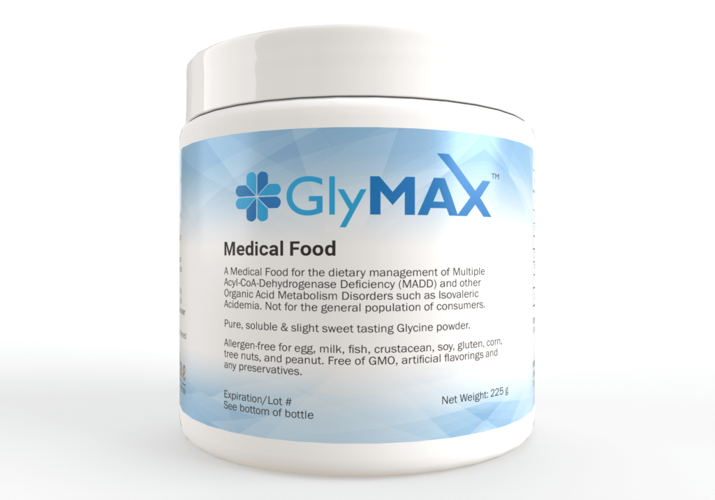 GlyMAX? is a pure white, soluble, Medical Food that contains naturally-sweet Glycine. It is intended for the dietary management of Multiple Acyl-CoA-Dehydrogenase Deficiency (MADD) and other organic acid metabolism disorders, including isovaleric acidemia. This powder is shelf-stable and readily soluble in water.??
